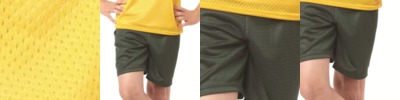 100% polyester wicking mesh ; Wicks moisture away from the body; Girls' fit; Covered elastic waistband with inside drawcord; 5-inch inseam (Ladies Large); Double-needle hemmed bottom.;