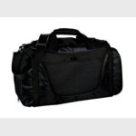 This duffel has it all when it comes to value, style and on-the-go organization. 600 denier polyester with polyester dobby contrast Web handles with padded grip D-shaped zippered opening for easy access Detachable,adjustable shoulder strap Built-in bottom board for shape retention and strength Exterior mesh pocket Front exterior pocket with hook and loop closure Four durable, protective feet Dimensions: 11.75"h x 27"w x 10"d; Approx. 3,173 cubic inches