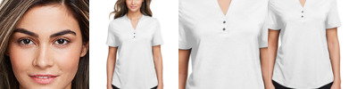 6.6 oz./yd² / 225 gsm, 100% polyester jersey; Snag protection plus; Moisture-wicking; Antimicrobial performance; UV protection; Matching knit collar; Side vents; 4-button placket with dyed-to-match buttons; Narrow placket for femine look; Industrial Laundry Tested to 75 washes; Carbon neutral style in partnership with Green Story third party verified carbon offset program. For more information click on carbon neutral link above MSRP. ;