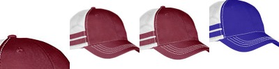 100% brushed performance microfiber polyester; Soft mesh back panels; 6-panel, structured, mid-profile; Vertical two-stripe contrast detail down center of mesh back panels; Precurved visor with contrast color sandwich; Contrast color, self-fabric, end-on-end hook and loop closure matches front panels;