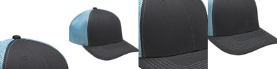 100% brushed cotton, mid-weight twill crown & visor; Soft mesh back panels; Charcoal grey front panels & visor with contrast color back mesh panels; Matching color sewn eyelets and grey top button; 6-panel, structure, midprofile; Grey plastic snap back closure; Semi-flat visor;