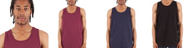 6 oz., 100% USA cotton, 18 singles; Durably knitted high-density fabric; Heather Grey is 90% USA cotton/10% polyester; Self binding neck and armholes; 1" double-needle stitched bottom hem;