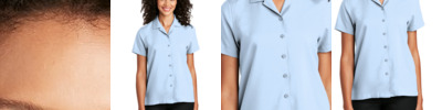 3.4 oz., 100% cotton yarn dyed poplin; semi-fitted styling; gingham microcheck pattern; soft-collar styling; curved hemline; bust and back darts for feminine fit; Oeko-Tex® Standard 100 certified; WRAP certified;