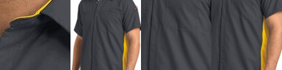 - Two button-thru, hex-style pockets with angled bartacks, bartacked pencil stall on left pocket