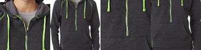4.9 oz. 65/35 cotton/polyester; Solid jersey body; Raglan sleeves; Pouch pockets; Hem cuffs and bottom; Drawstring hood;