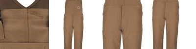 - Snap front closure, hook-and-loop fly with adjustable sides and elastic back