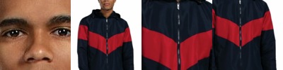 - Contrast-color, topstitched self-fabric sleeve stripes