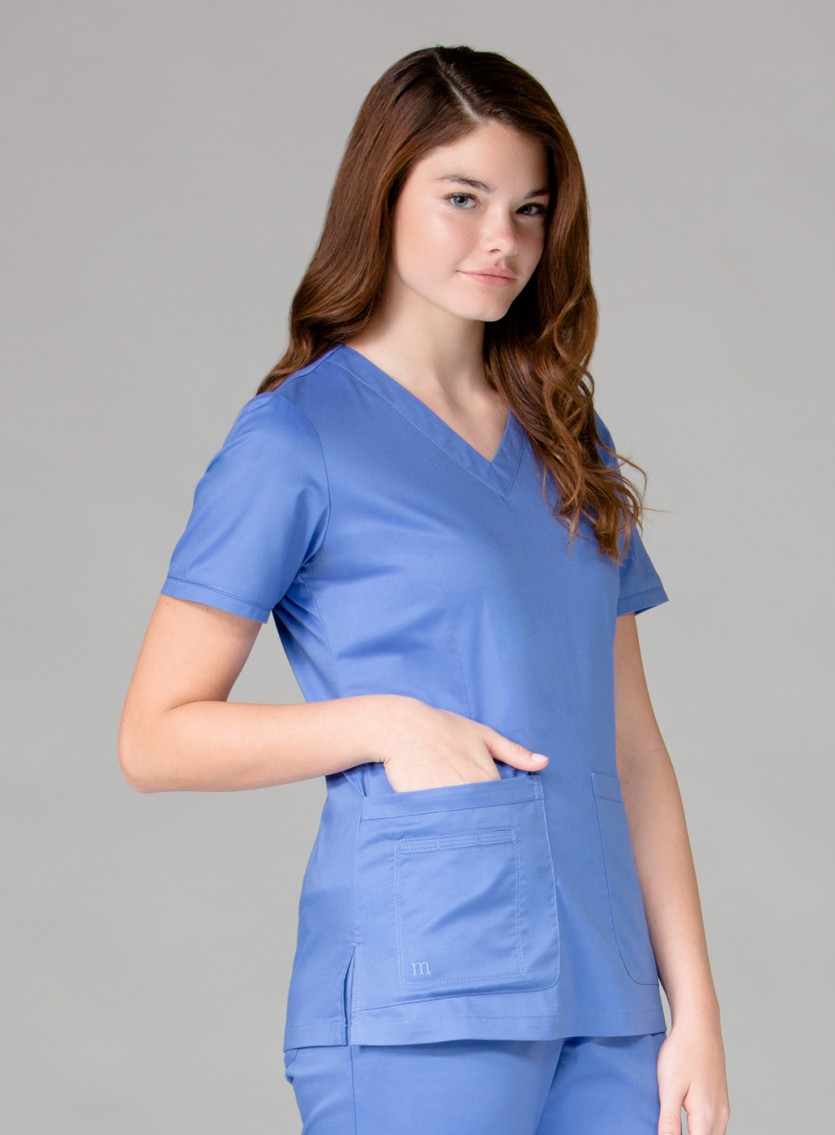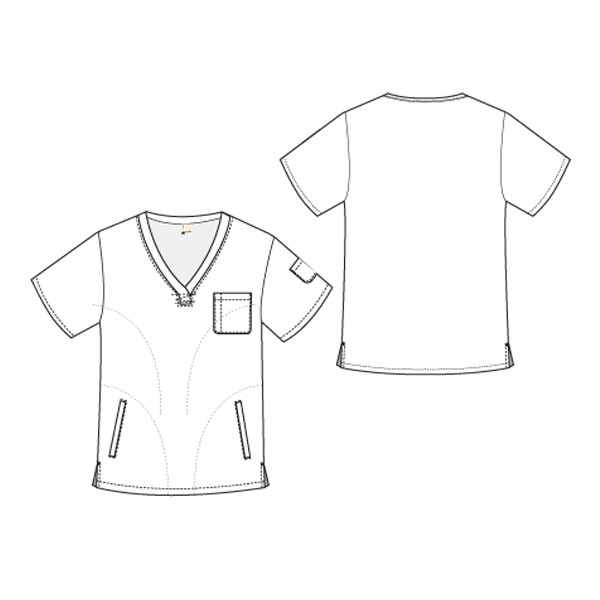 If this top had more storage, we'd have to call it a garage! This five pocket top is an easy-to-wear V-neck pullover with one breast pocket, two lower layered pockets on the left and a single pocket with an interior cell phone division on the right. Locker loops make this top easy to hang up after a long shift. 65% Polyester/ 35% Combed Cotton Medium regular length 30"