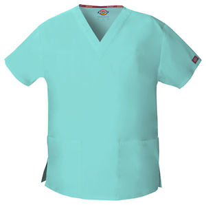 A missy fit, v-neck top features Dickies logo twill tape at the back neck, patch pockets, a stretchy knit interior pocket, and side vents. Center back length: 27".